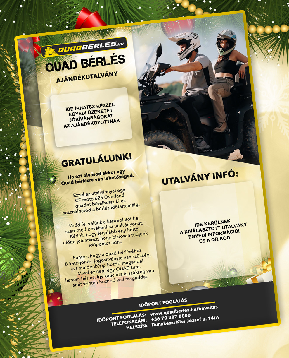 QuadBérlés.hu kínálatában megtalálható a Quad bérlés ajándékutalvány, amelyet karácsonyi ajándék formájában is megrendelhetsz.